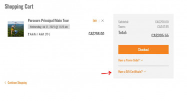Les prix de Ziptrek varient en fonction du circuit, du nombre et de l'âge des participants, vous êtes donc libre de choisir le montant que vous souhaitez. Voici un exemple de montant de certificat cadeau pour deux adultes, taxes incluses: